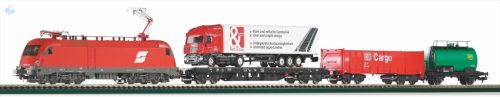 A készlet, amely egy Taurus elektromos mozdonyából áll, három teherkocsival, amelyek közül az egyik csuklós teherautóval van megrakva.