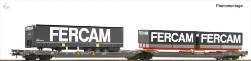 Egy félpótkocsis teherautóval és a Fercam szállítmányozó cég két cserefelépítményével megrakva, öntött fémből készült vagonok