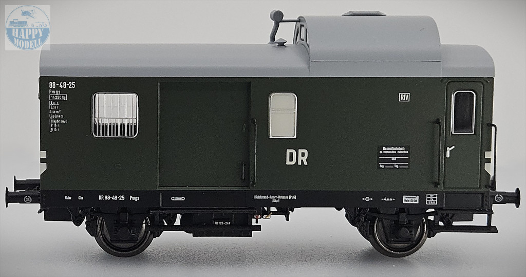 ROCO 6210175A Deutsche Reichsbahn Pwgs típusú tehervonati kisérőkocsija.- Három ablakos tetőpult- Lépcsőkkel a raktér ajtaja alatt- A tolóajtók három helyzetbe szerelhetők (zárt, félig nyitott, nyitott)- Kapcsolható belső világítás és hátsó világítás digitális üzemmódbanAz 1950-es években a Waggonbau Bautzen a DR megbízásából egy rövid poggyászkocsit épített tehervonatok számára. Két sorozatban több mint 200 kocsit szereztek be. Különlegességként a kocsik beépített hátsó jelzőkkel rendelkeztek, amelyek piros és fehér felületét forgó fényernyőkkel lehetett lefedni.